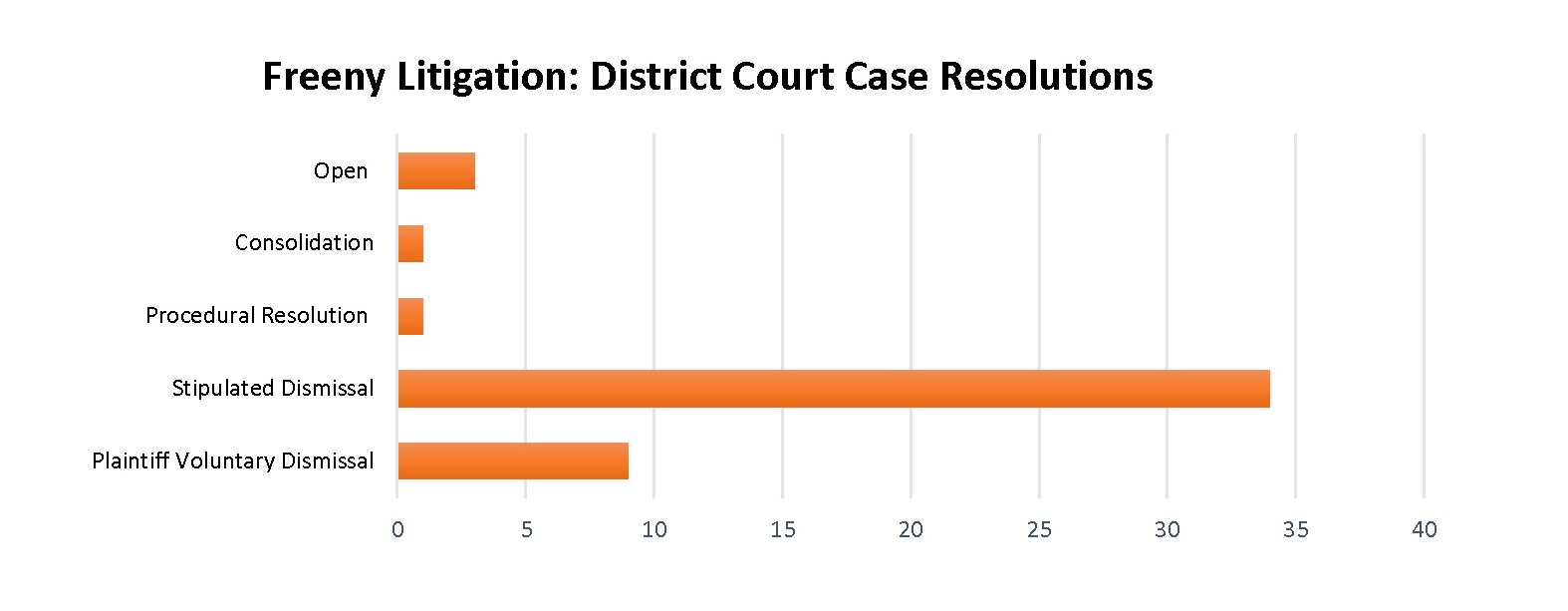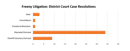 The undisclosed, stipulated dismissal resulting from the Freenys’ lawsuit with Oki is not an uncommon outcome, and indeed is likely the ideal outcome for NPEs and PAEs alike – a fruitful result for the NPE without the expense or hassle of trial. While the Freenys have recently targeted companies in the cloud printing space, such as Xerox and Oki, they have also asserted the same family of patents against other defendants who occupy the wireless speaker, mobile device, fitness and navigation wristband, and general consumer electronics spaces such as Bose, Samsung, Motorola, Garmin, Fitbit, Walt Disney, and Belkin. Like Xerox and Oki, these other defendants manufacture and/or use electronic devices capable of connecting to multiple other devices to perform a multitude of tasks, and each utilize cloud technology. Of particular interest, however, similar to the outcome in the Oki litigation, 91% of all lawsuits filed against these additional defendants in district court resulted in likely settlements – with the Freenys voluntarily dismissing nine of their suits, and in 34 other suits both parties entered into joint stipulated dismissals. The breadth of the Freeny litigation serves as a prime example of what appears to be the NPEs ever-growing expansion of overly broad patent assertions into the cloud computing space against a wide array of technology companies that utilize the convenience of The Cloud.