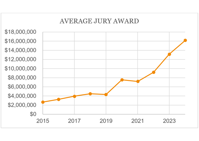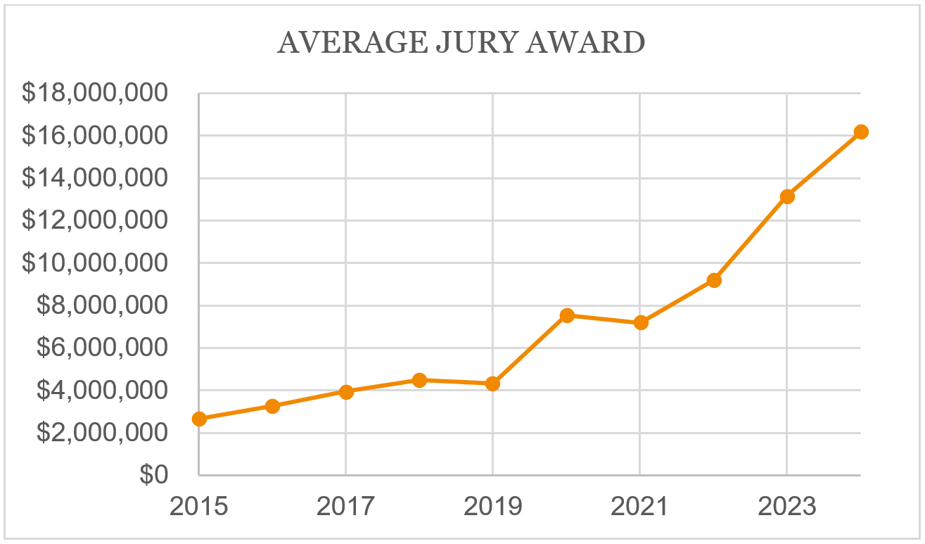 The most dramatic growth has occurred in jury verdicts. In 2024, the average jury award exceeded $16 million, nearly double the 2022 average, which itself had doubled since 2019. The median jury award also showed significant growth, reaching $680,000 in 2024. This marks the first time median jury awards have surpassed $500,000.